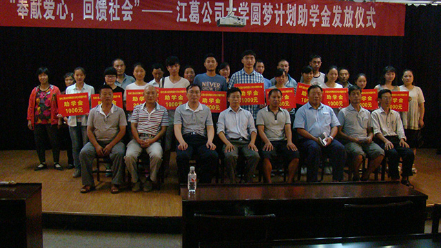 2016年8月25日上午,,,,湄潭县总工会副主席周光应、教育局办公室主任叶云勇、黄家坝镇街道效劳处党委委员何文杰、岩孔坝村支部书记周明德、村主任殷森林及梭米孔村支部书记陈普联、村主任石志强,,,,受资助的学生和学生家长,,,,公司向导及部分职工代表配合加入了我公司举行的“贡献爱心,,,,回馈社会”——江葛公司大学圆梦妄想助学金发放仪式。。。。